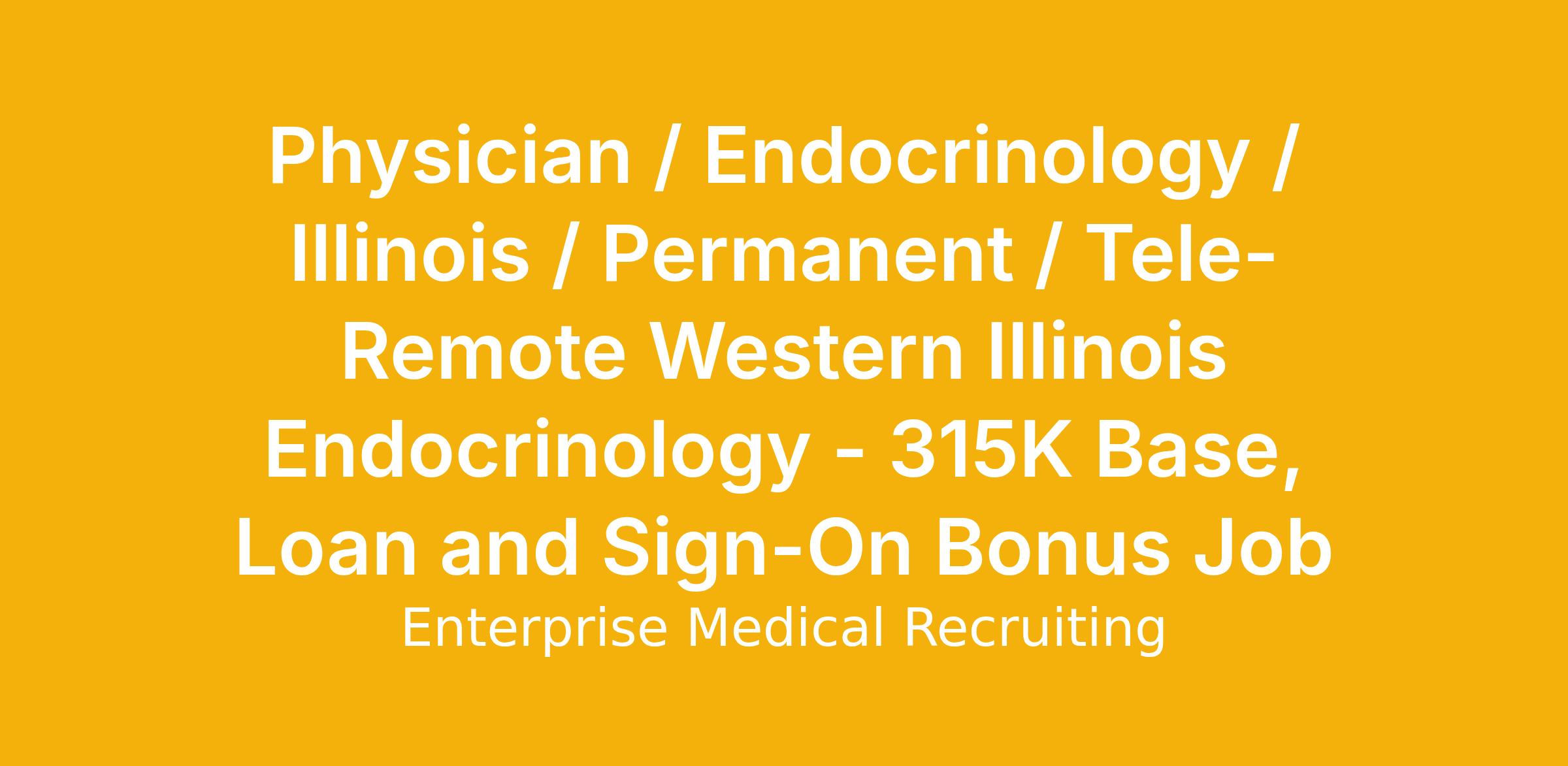 Physician / Endocrinology / Illinois / Permanent / Tele-Remote Western Illinois Endocrinology - 315K Base, Loan and Sign-On Bonus Job