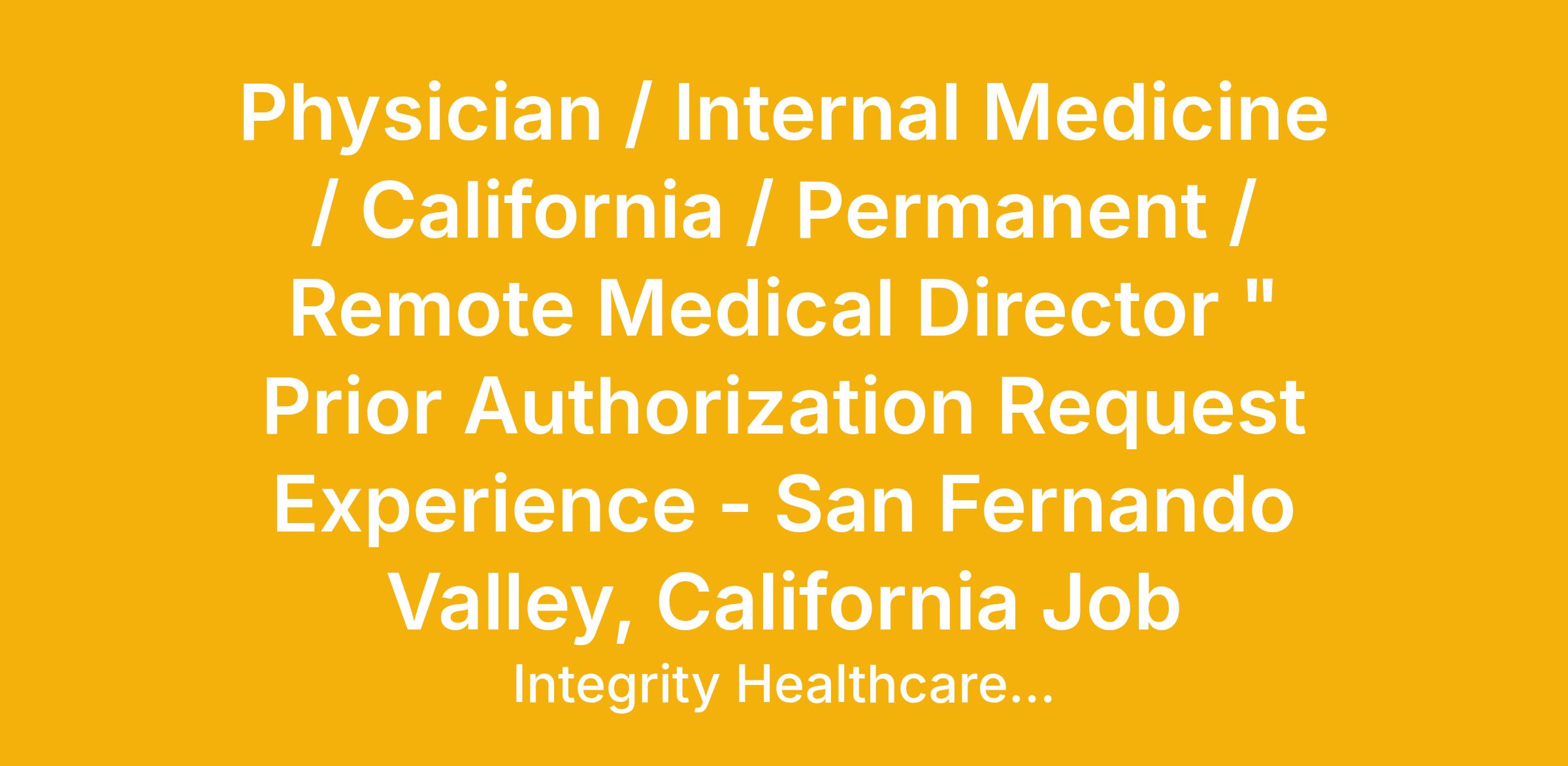 Physician / Internal Medicine / California / Permanent / Remote Medical Director " Prior Authorization Request Experience - San Fernando Valley, California Job