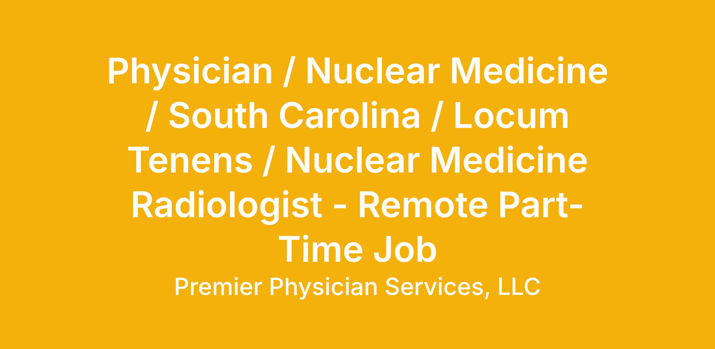 LONG TERM POTENTIAL but must have SC license as won't start creds until license is first obtainedRemote Radiologist with PET specialty needed to read PETs scans only twice a week - Sundays & Thursdays anytime.Provide weekly availability upon submission6-10 Pets per shiftPotential Rates: $150/PETPACSRP Cloud & EMR is ClarioFor additional details on this opportunity or others, please contact Cheryl at Apply Here or Click to See Phone . If this position isnt the right fit, we have a variety of other opportunities available and would love to help you find the right match.Join us in providing outstanding care while enjoying the flexibility and rewards of a locum tenens role!
