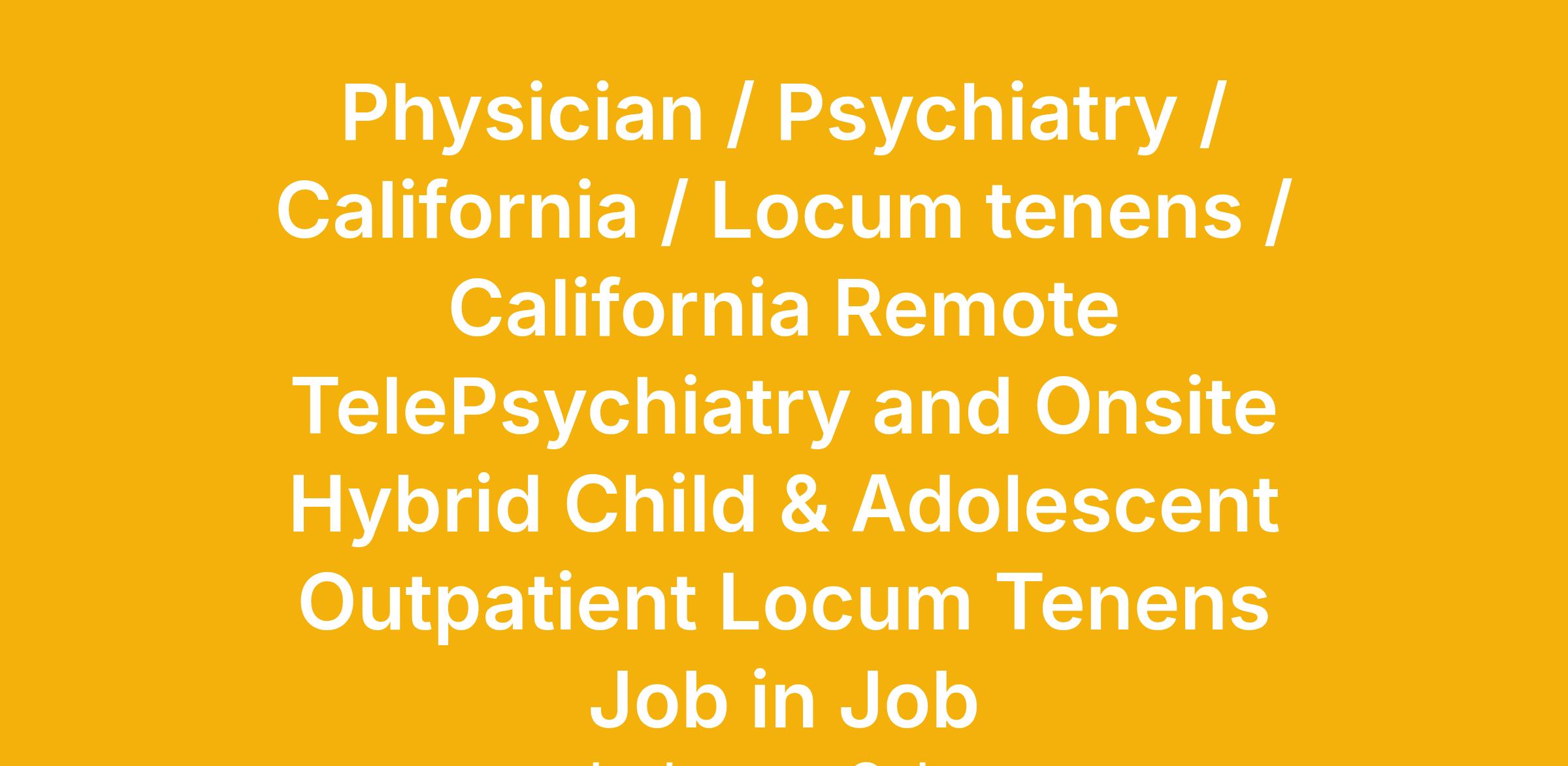 Physician / Psychiatry / California / Locum tenens / California Remote TelePsychiatry and Onsite Hybrid Child & Adolescent Outpatient Locum Tenens Job in Job