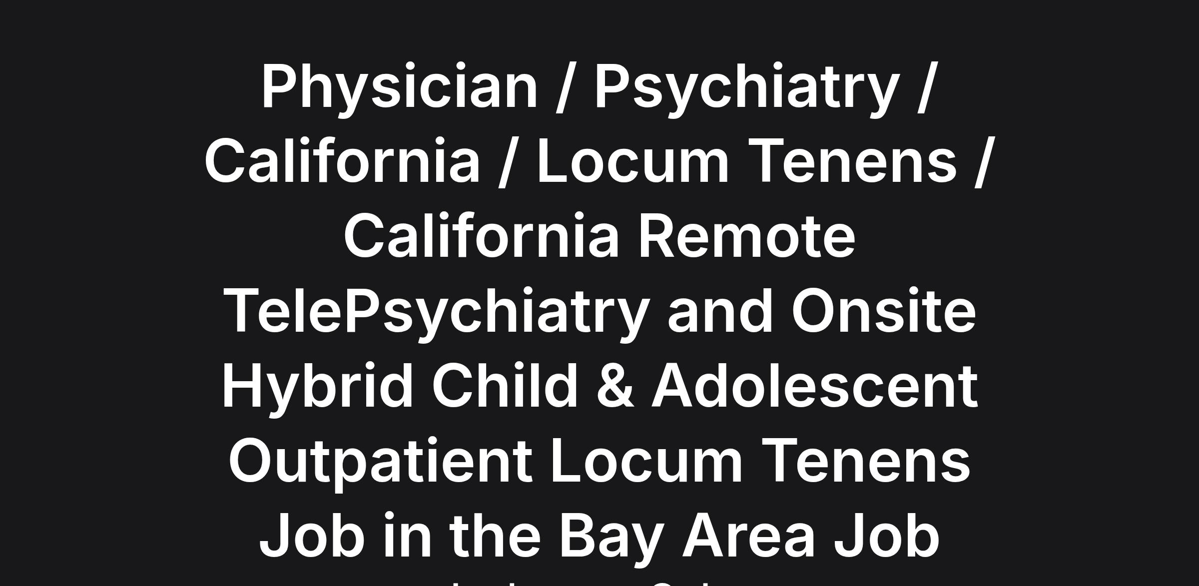 California Remote TelePsychiatry and Onsite Hybrid Child & Adolescent Outpatient Locum Tenens Job in the Bay Area Details/Requirements: Need starts 6/1/26 X two months for child & adolescent outpatient coverage for 2-3 hours a week at most, for vacation coverage.