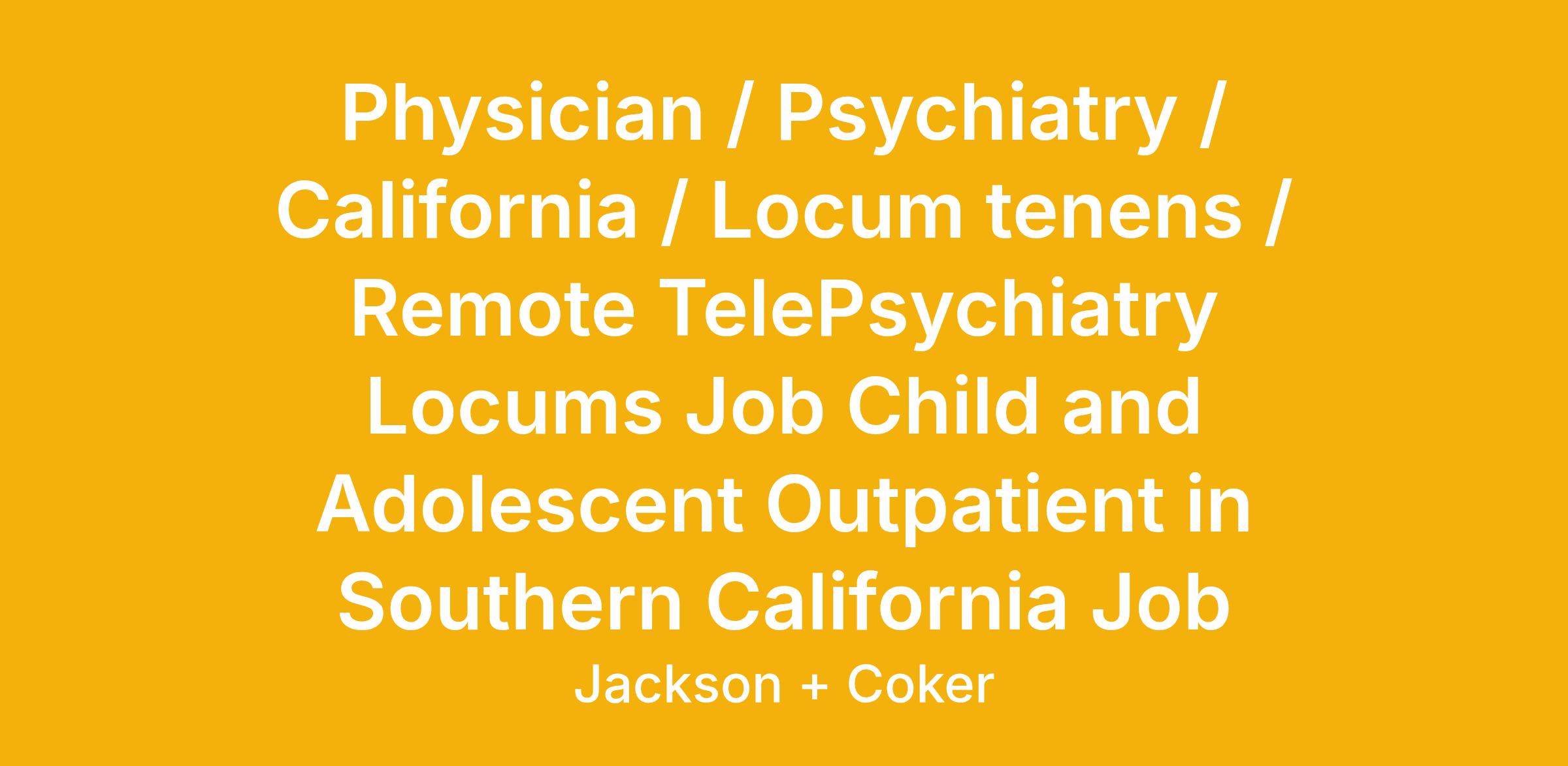 Remote TelePsychiatry Locums Job Child and Adolescent Outpatient in Southern California Details/Requirements: Child & adolescent outpatient coverage for two 8 hour days per MONTH. Remote telepsychiatry using Zoom with electronic prescription ability through their E.H.R. Must be a child trained Psychiatrist. Board Certification is strongly preferred. See children and adolescents ages 5 and up. Flexible regarding days and hours worked as long as between 8am and 5pm, Monday through Friday. Typically services have been done on the 1st and 4th Tuesday of each month, but that s not set in stone. No call One hour for initial evaluations and 30 minutes for medication follow ups. You will have an RN to assist you. Average 8 to 10 patients per day in an 8-hour day; with one to two initial evaluations daily and the remainder medication management. Three to six month minimum assignments preferred, but the longer the better. Must be comfortable using computers and have solid typing skills, due to electronic medical record system. Jackson and Coker offers: + Weekly Direct Deposit + Top Rated Malpractice Insurance + In-Hous