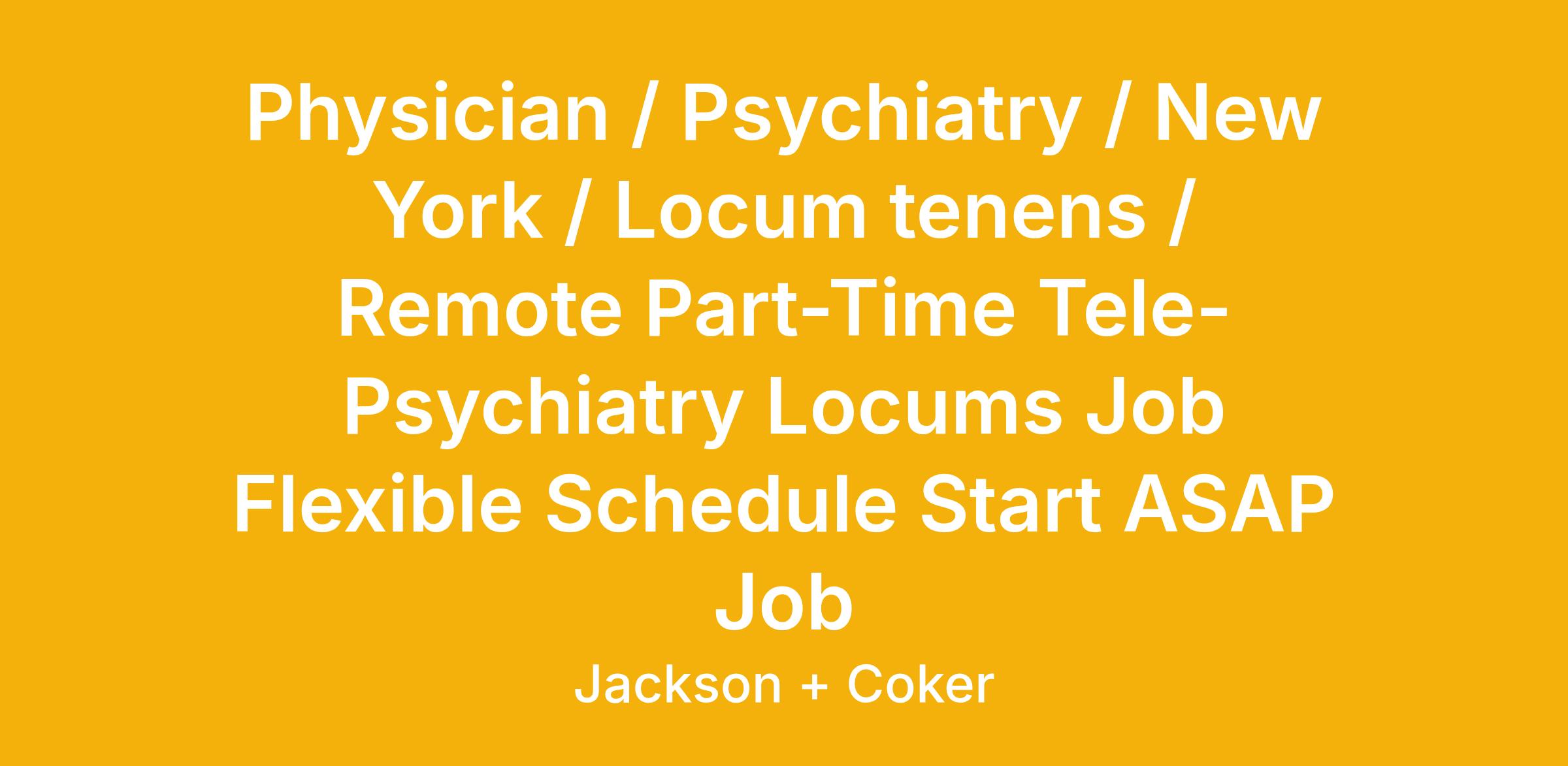 Remote Part-Time Tele-Psychiatry Locums Job Flexible Schedule Start ASAP Opportunity to build your own schedule and earn supplemental income! Details/Requirements: No controlled substance prescribing Low acuity psychiatry appointments Will see ages 14 and up Mostly dealing with stress and anxiety Will use Telehealth platform to see patients virtually Would like for you to be available at least three hours per week and logged in for at least one hour increments Schedule is very flexible Appointments with patients are scheduled Paid per consult Jackson and Coker offers: + Weekly Direct Deposit + Top Rated Malpractice Insurance + In-House Travel Agency + 24/7 Recruiter Availability + Experienced In-House Privileging Coordinators Experience why Jackson and Coker has been recognized by Forbes and Staffing Industry Analysts for our commitment to service excellence. Apply Today! Mallory McCarthy For more jobs, visit Jackson and Coker .