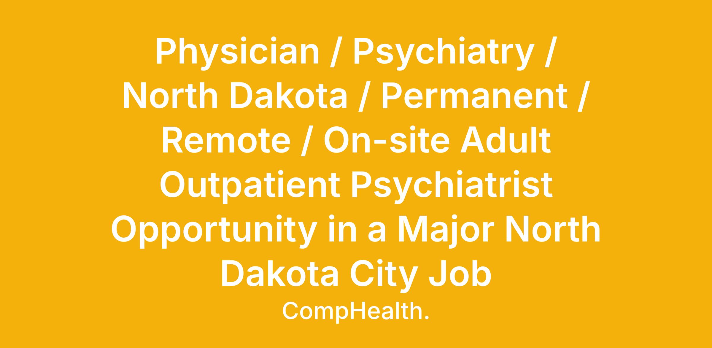 Physician / Psychiatry / North Dakota / Permanent / Remote / On-site Adult Outpatient Psychiatrist Opportunity in a Major North Dakota City Job