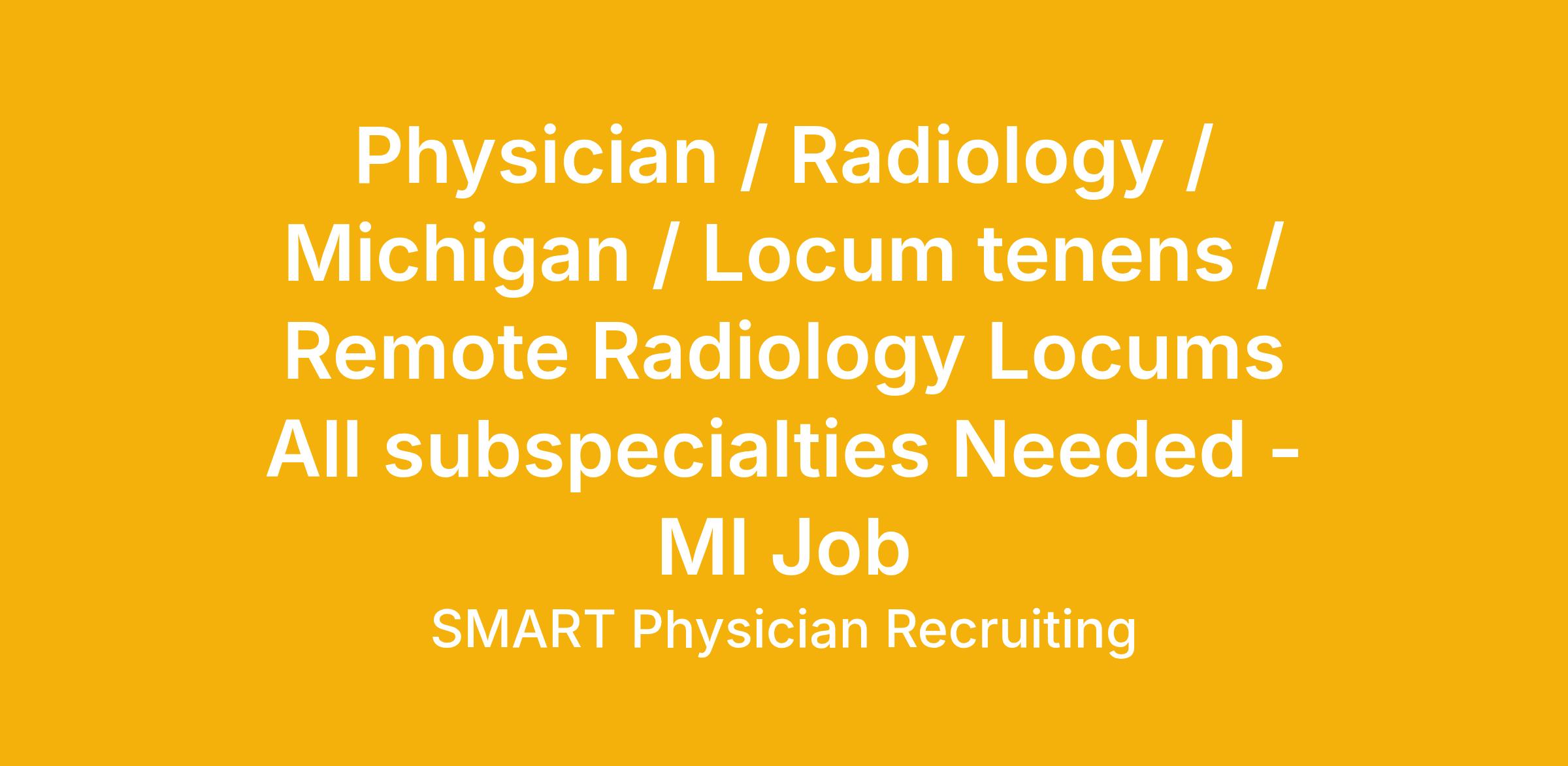 Physician / Radiology / Michigan / Locum tenens / Remote Radiology Locums All subspecialties Needed - MI Job