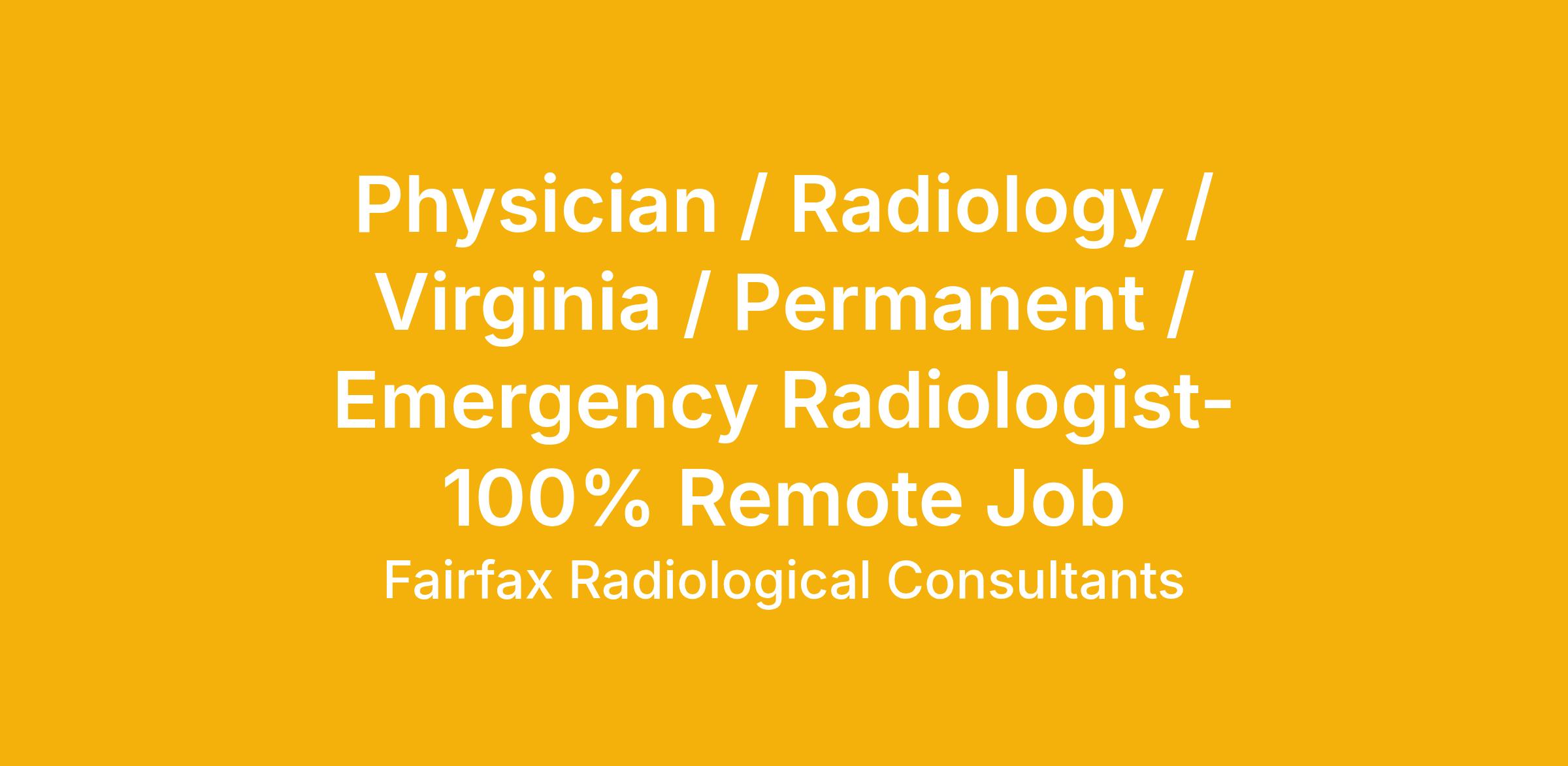 Fairfax Radiological Consultants, PLLC (FRC) is a large sub-specialized radiology practice located in the Northern Virginia suburbs of Washington, D.C. We are seeking a dedicated overnight radiologist to expand our section of Emergency Radiology. This is a unique opportunity and provides options for physicians who want to work 100% remotely.The ideal candidate will have a specific interest in practicing radiology in the Emergency Department setting. The overnight rotations will be covered by a 9-person section of Emergency Radiology working in 3-person teams with a staffing paradigm of 1 week on and 2 weeks off. FRC includes more than 120 sub-specialty radiologists providing services at 5 major hospitals in the Northern Virginia suburbs including Inova Fairfax Hospital in tertiary care center, level 1 trauma center, with an integrated Cardiac, Womens, and Pediatric Hospitals. In addition, FRC provides professional services to more than 20 outpatient facilities throughout Northern Virginia.Benefits include:Competitive compensation package commensurate with experience and qualifications.Comprehensive benefits package, including medical, dental, and vision insurance as well as fully funded 401k profit-sharing plan.CME allowance.Opportunities for professional growth and career advancement within a well-established radiology practice.Access to state-of-the-art imaging technology and resources.Supportive work environment fostering collaboration and teamwork. The National Capital Region boasts proximity to museums, performing arts, and sports. Current physicians live anywhere from the district to the rural suburbs and enjoy nationally recognized schools.Direct inquiries and CVs to: